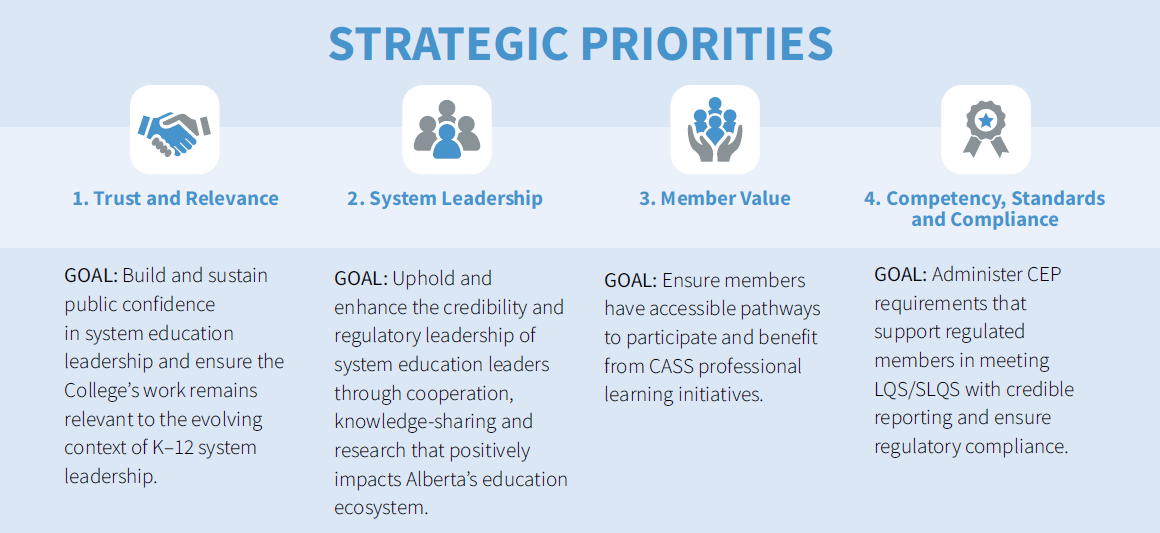 CASS is a statutory corporation established under the College of Alberta School Superintendents Act and regulated by the expectations of this legislation, complementary bylaw, and policy provisions. CASS’s governing legislation sets our Success Indicators, including advancing education in Alberta, improving the profession and system leadership through continuing education, research, and publication, increasing public understanding of education and leadership, and cooperating with related organizations.